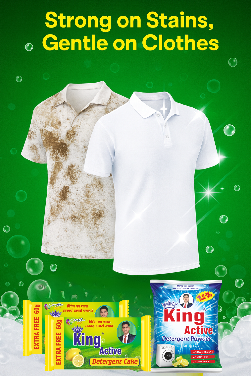 King Active detergent cake is formulated to tackle tough stains like oil, mud, sweat, and everyday dirt, making clothes look cleaner after every wash.